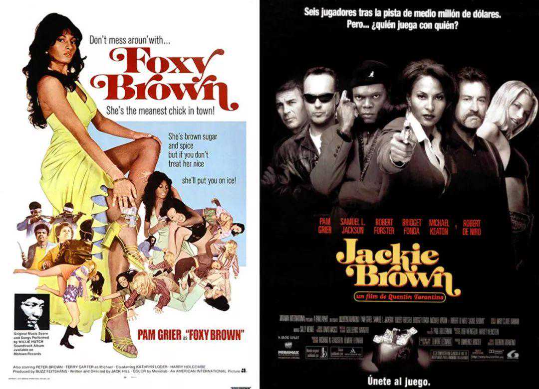 首先标题JackieBrown,就是戏仿帕姆·格里尔1974年主演的电影[骚狐狸]FoxyBrown,连海报上标题的字体都一样。