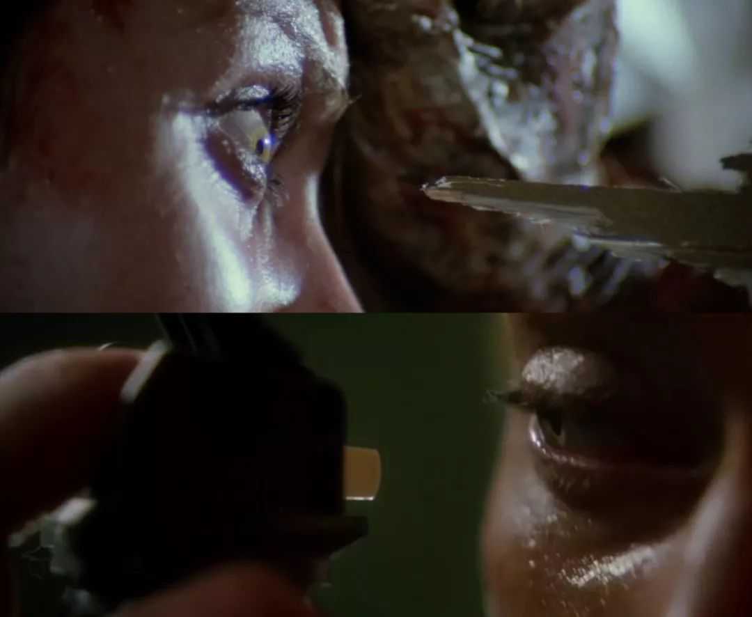 这种尖锐物体逼近脆弱眼球的恐怖感受,来自于[生人回避2],木刺残渣逼近女主角的眼睛。