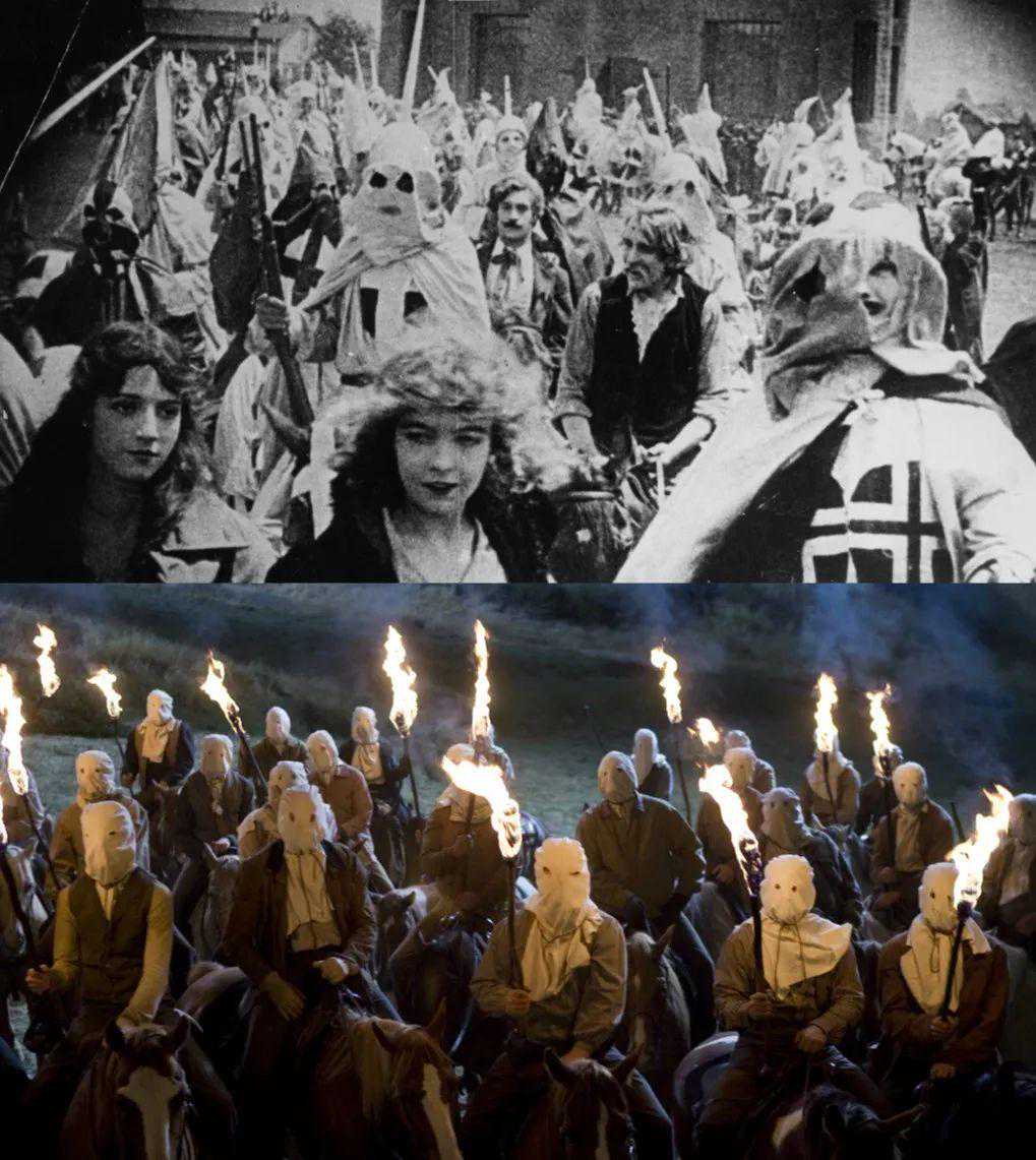 影片中,白人庄园主带队偷袭舒尔茨和姜戈,聚众戴上白布面罩,这一段致敬了1915年大卫·格里菲斯那部饱受争议的[一个国家的诞生]。