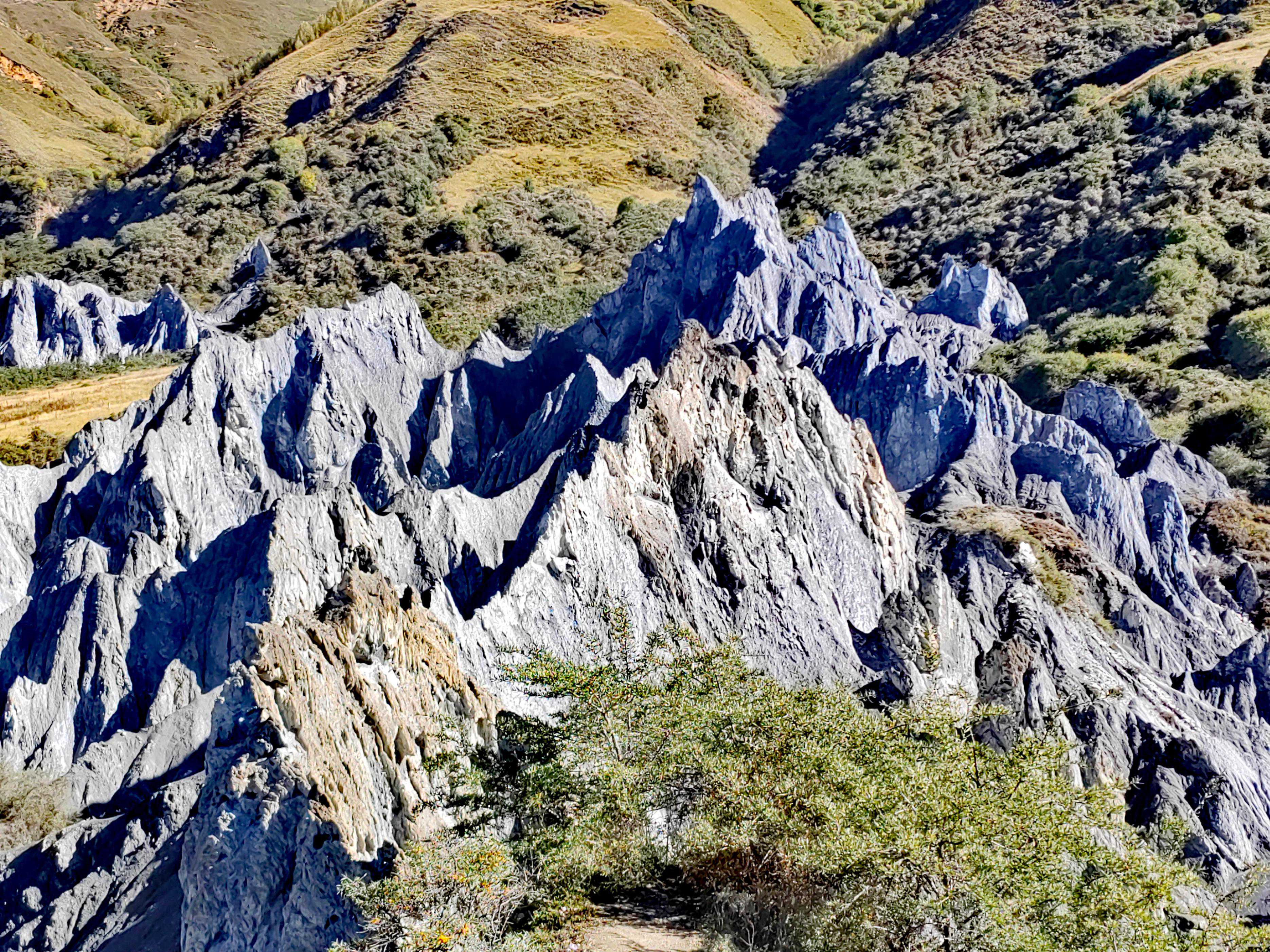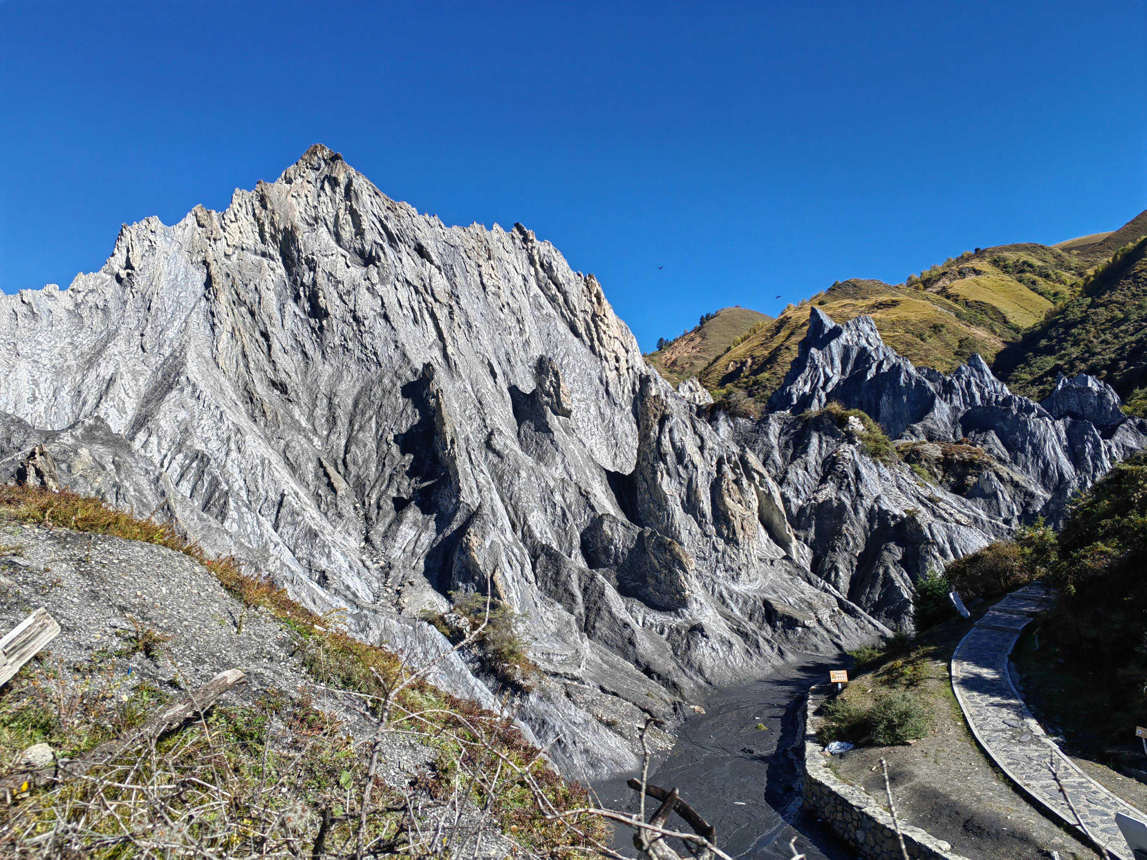 今天道孚出发,经八美镇、丹巴县城,到党岭村。连接道孚和丹巴的是G350国道,它还有一个响亮的名字——中国熊猫大道。这也是一条景观大道。在八美镇有墨石公园,也是一种石林景观。它的地质成因、景观特点、微地貌形态和自然环境方面十分特殊,类似的石林在国内外尚未见报道。墨石公园的石林,在不同时间、光线下其颜色是变化的。