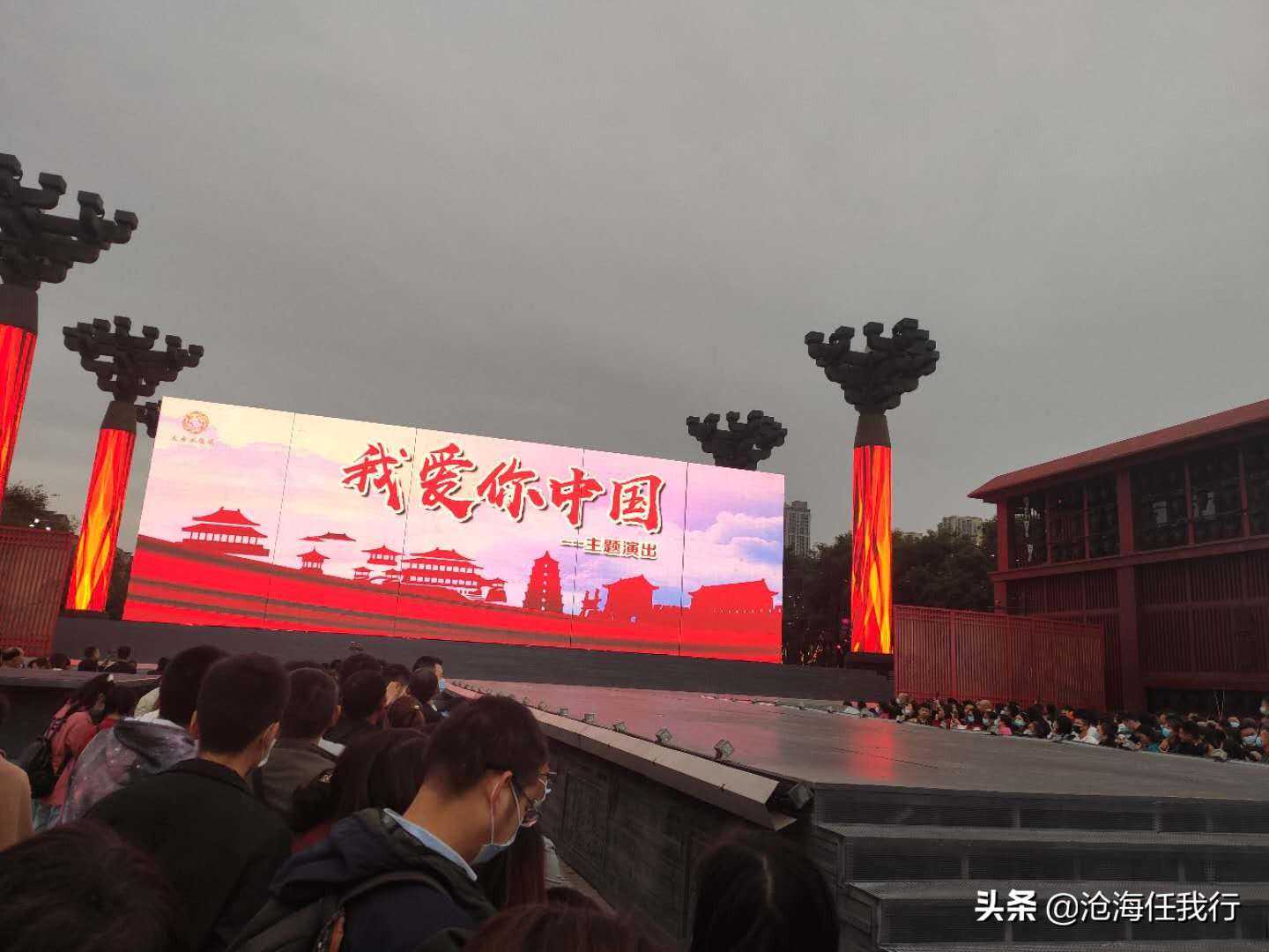 6点,广场上免费观看大型演出《我爱你中国》。夜色渐浓,花灯齐上,大唐不夜城呈现出它最为璀璨的夜景。