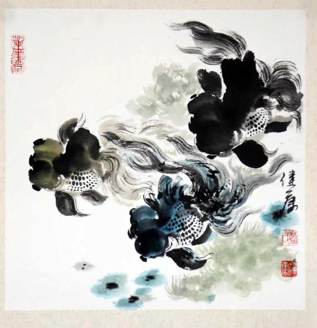 在《庄子●秋水》一文中,庄子透过羡慕鱼的自由,表达了他对内心人生自由的追求。蓝健康喜欢赏鱼、画鱼,并坚持用原生态的艺术创作手法,更体现了中国文人骨子里那种对不为功名羁绊、不为繁华所动的大自由的向往之情。画鱼要画出鱼儿游泳时候的神态,要表现出鱼自由自在、恣意荡漾,在水草中浮沉游转的样子。要画出鱼儿悠闲、机警的姿态,如果只是把外形画准,而画不出鱼儿的神情,那么即使你画的是溪水和山涧中的鱼,也和砧板上的死鱼没有什么了两样。