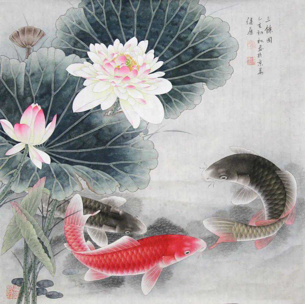 鲤鱼的品性体现了中华民族质朴善良、勤劳勇敢、厚德载物、热爱和平的美德,也饱含着华夏思想之精萃。也因此蓝健康才为之入迷,并创作了一幅幅精绝墨宝。观其画笔法,细腻生动,别有韵味,可谓是出神入化。