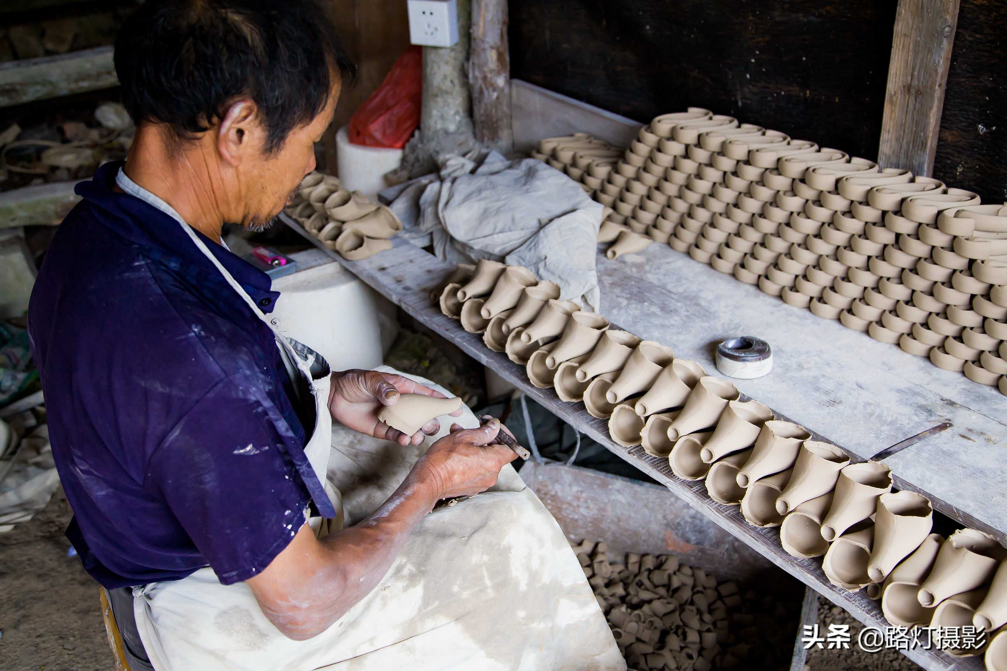 这些是制作瓷器用的模具,这是德化月记窑的瓷土加工区,脱模成型的瓷壶,出于原始状态,还需要精工细作。