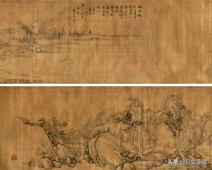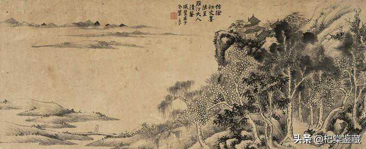 题识秋水接天三万顷,晚山连树一千重。呼他小艇过湖去,卧看斜阳江上峰。辛卯春暮之初,雁汀先生雅属,甬上吴涵。钤印枕山诗画、谁来买我画中山