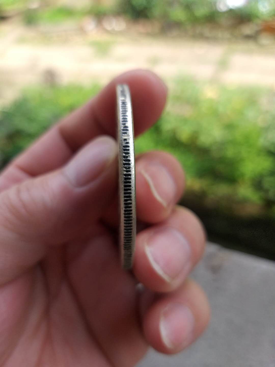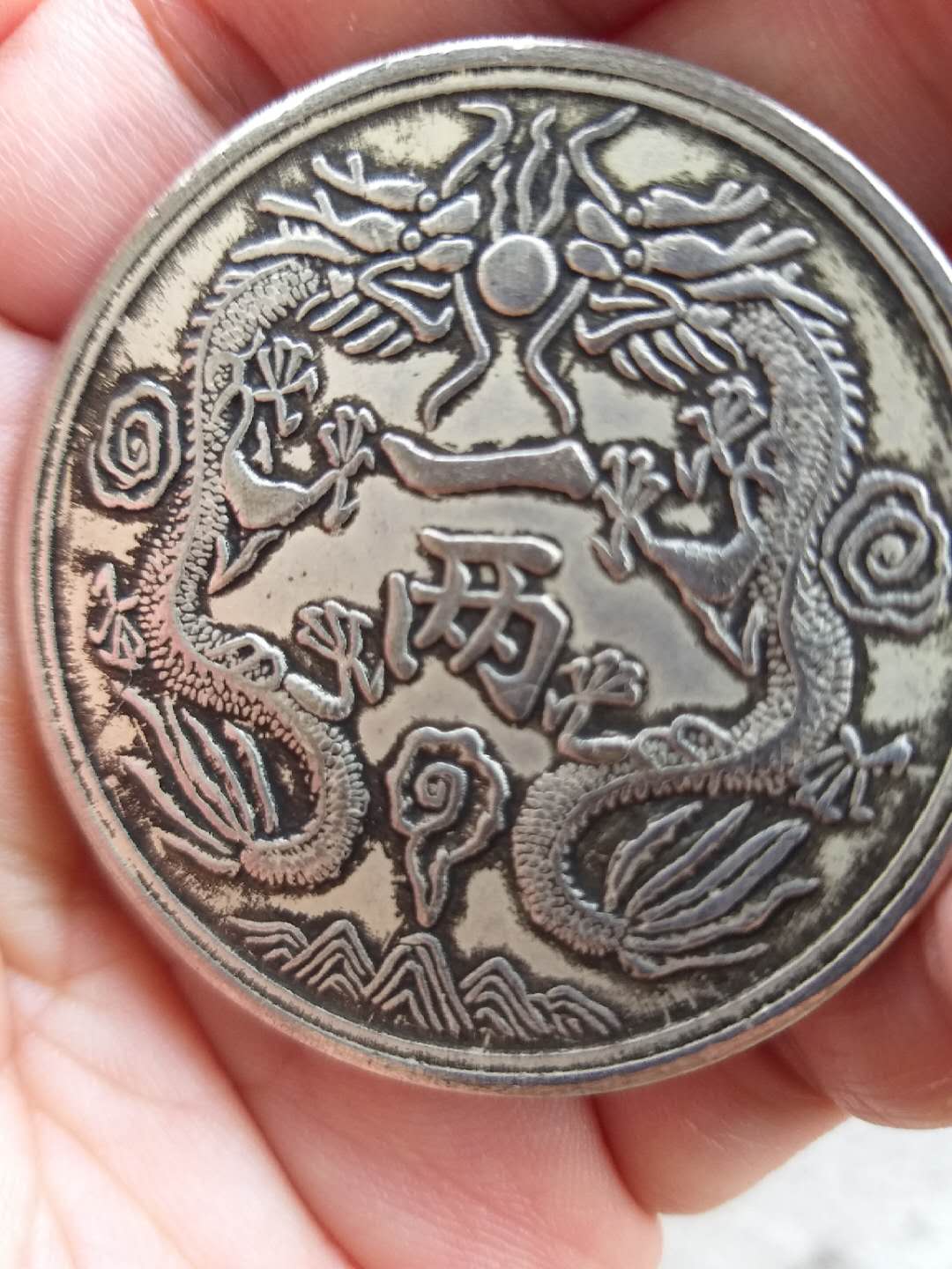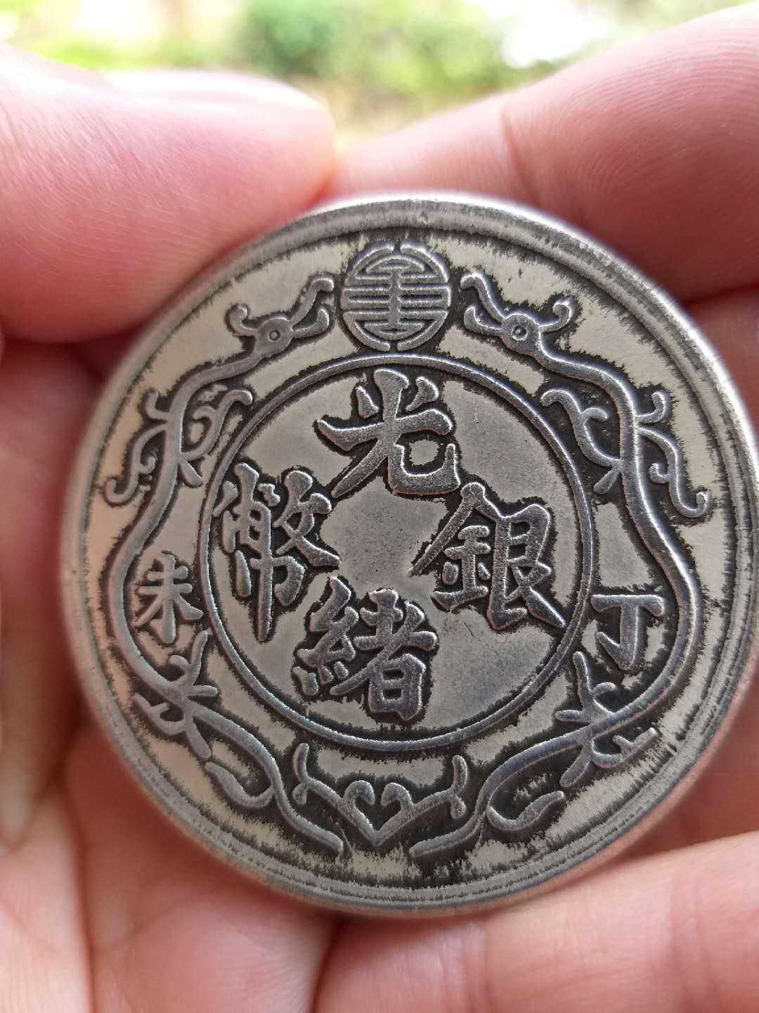 光绪银币一两丁末大版钱,该币正面观之,该币系为祝寿纪念币,上有寿字,下有抽象蝙蝠图案,寓意福寿二字,取其吉祥。左右各有两条抽象古龙,龙首上点有眼珠。下有“丁未”二字,币中内环内镌刻“光绪银币”四字,币边无内齿,无明显纵横交错之定位线及定位点,此种币在大清机制币中十分稀少,但在币右侧有清晰之环状定图弧圈,币面光滑、平整,原光。网页链接