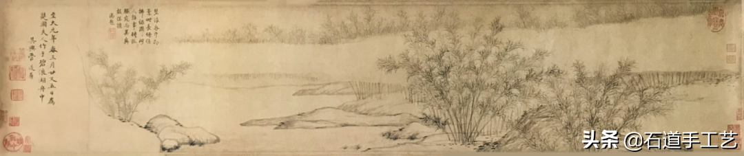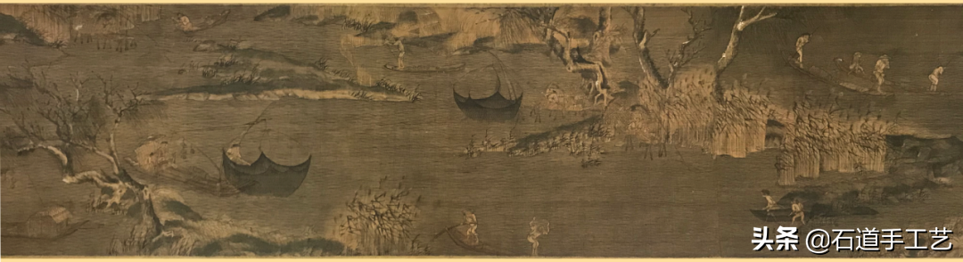 赵干(10世纪),江宁人。画善山水,为南唐李后主(李煜)画院学生。这卷写初冬江边渔作之景,全图以白粉弹雪,遂觉江天寒雪纷飞,将渔人艰辛作活情景描述殆尽。是目前传世作品中最早的一幅绢地山水人物并重之手卷画。