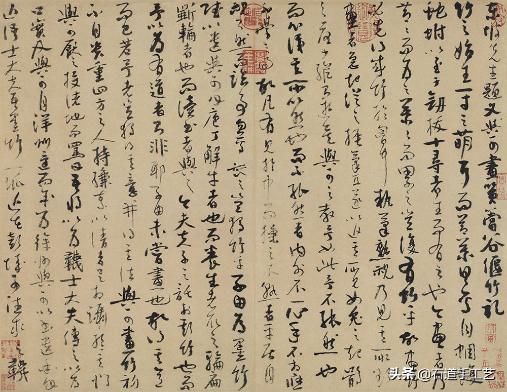 方从义(14世纪),贵溪人。字无隅,号方壶。元末上清宫道士。工诗文,善古隶,画师董源、巨然、米芾、高克恭,擅长山水,别具一格。这幅款题「醉后纵笔写之」,墨渖淋漓,浑朴高古。