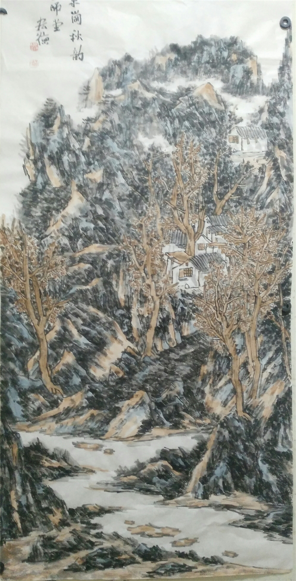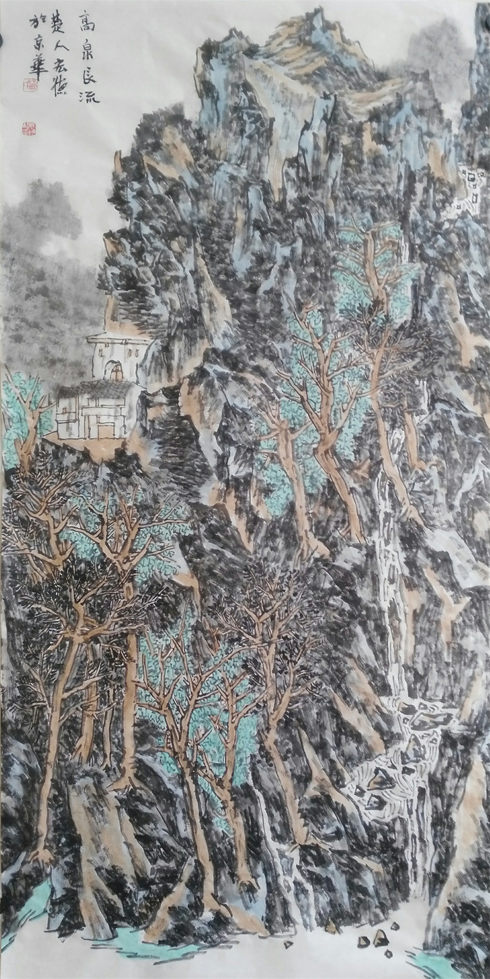 宏德先生对皱法的运用当是经过了一番推敲,没有拘泥于一山一石的画法,而是全面把握,把对真山真水的情感通过手中之笔谱写成俊朗、朴厚的画面。他继承发扬了自宋代以来山水画的成就,看其画面以斧劈皱法、米点皱法,把山石肌理,植被、季节、气象很贴切的表达了出来。而其全景式构图,其繁格的运用已见功力,读《近山村》、《长泉村》系列,用笔有着浑莽兴荒率的变化,这又透出他受了元画的影响。"抚琴动操欲令众山皆响”面对大山好水,这种心境让人动容,宏德先生首先是陷入自我的感动之中。