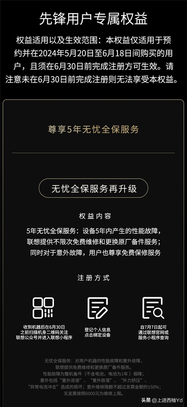 在6月18日之前购买,还赠送5年无忧全保,设备5年内产生的性能故障,联想提供不限次免费维修和更换原厂备件服务;同时对于意外故障,用户也尊享免费保修。