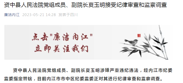 据廉洁内江消息,资中县人民法院党组成员、副院长夏玉明涉嫌严重违纪违法,经内江市纪委监委指定管辖,目前内江市市中区纪委监委正对其进行纪律审查和监察调查。