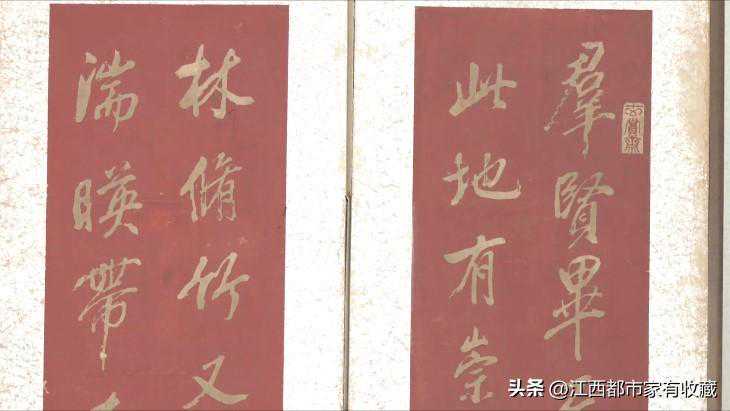 拓片最常见的底色多为墨色,字体多为白色。而这四件拓片的底色是朱砂红,字体是金色,用料选择可见不一般,从材料上我们都能猜到它价值不菲。另外,这四件拓片上的字体劲道有力,很有大家风范。