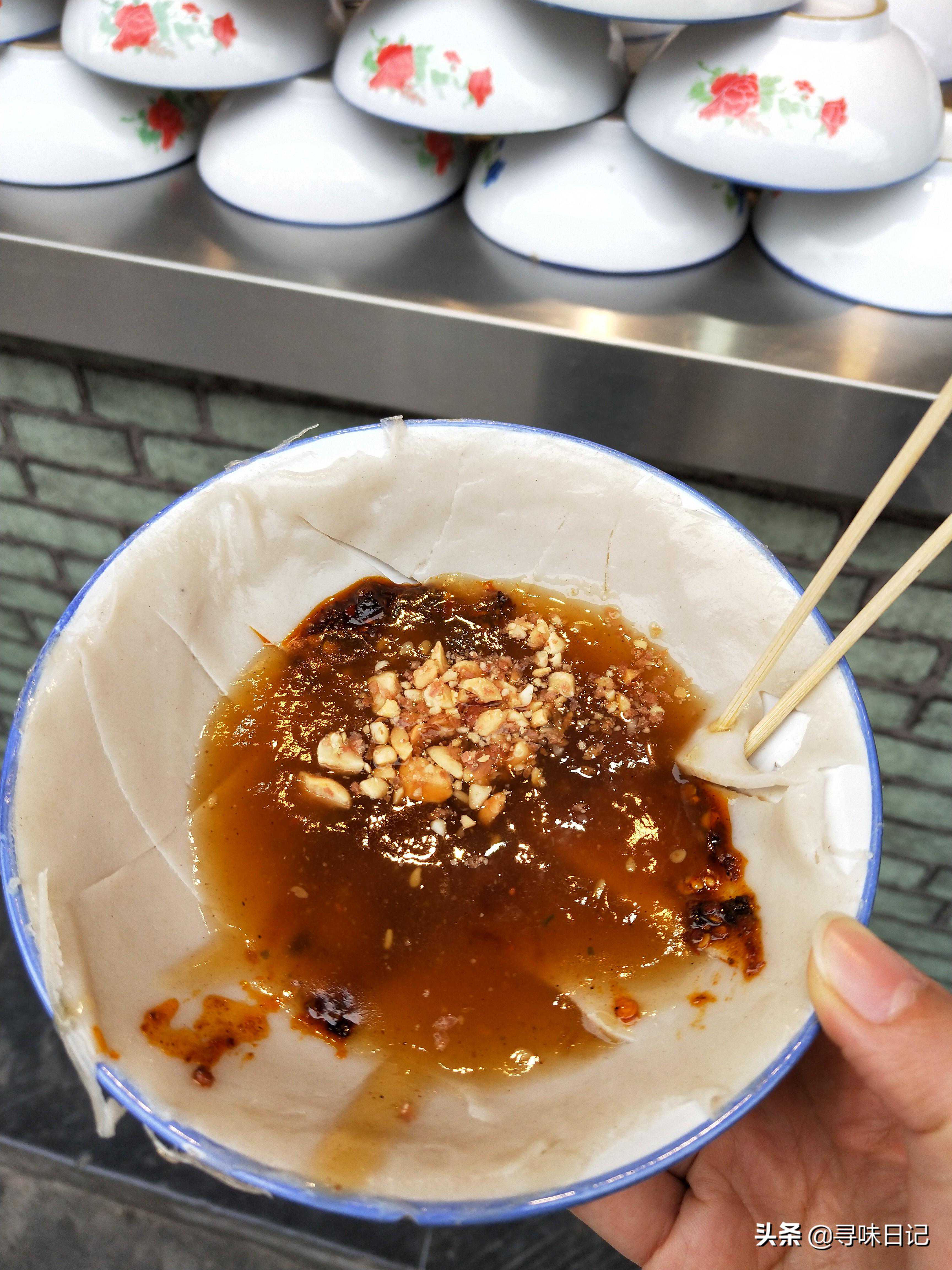 心想:咦,这什么东西?都没听过,还那么便宜,3块钱,这必须得尝尝了,就和老板说:"老板,我要一份。"只见老板拿来一个倒扣着的浅口大碗,我看到碗里贴着一层晶莹却不剔透的灰白色的面,他用小刀把面划了几刀,划成田字格,然后往里面加了一勺辣椒油、花生碎、蒜泥汁,最后再淋上些醋,