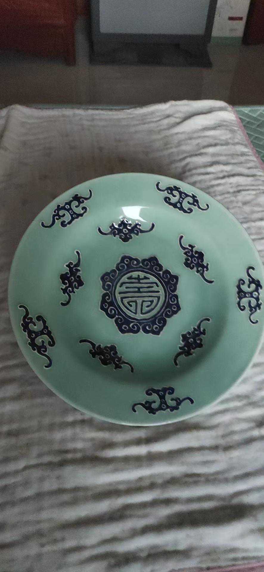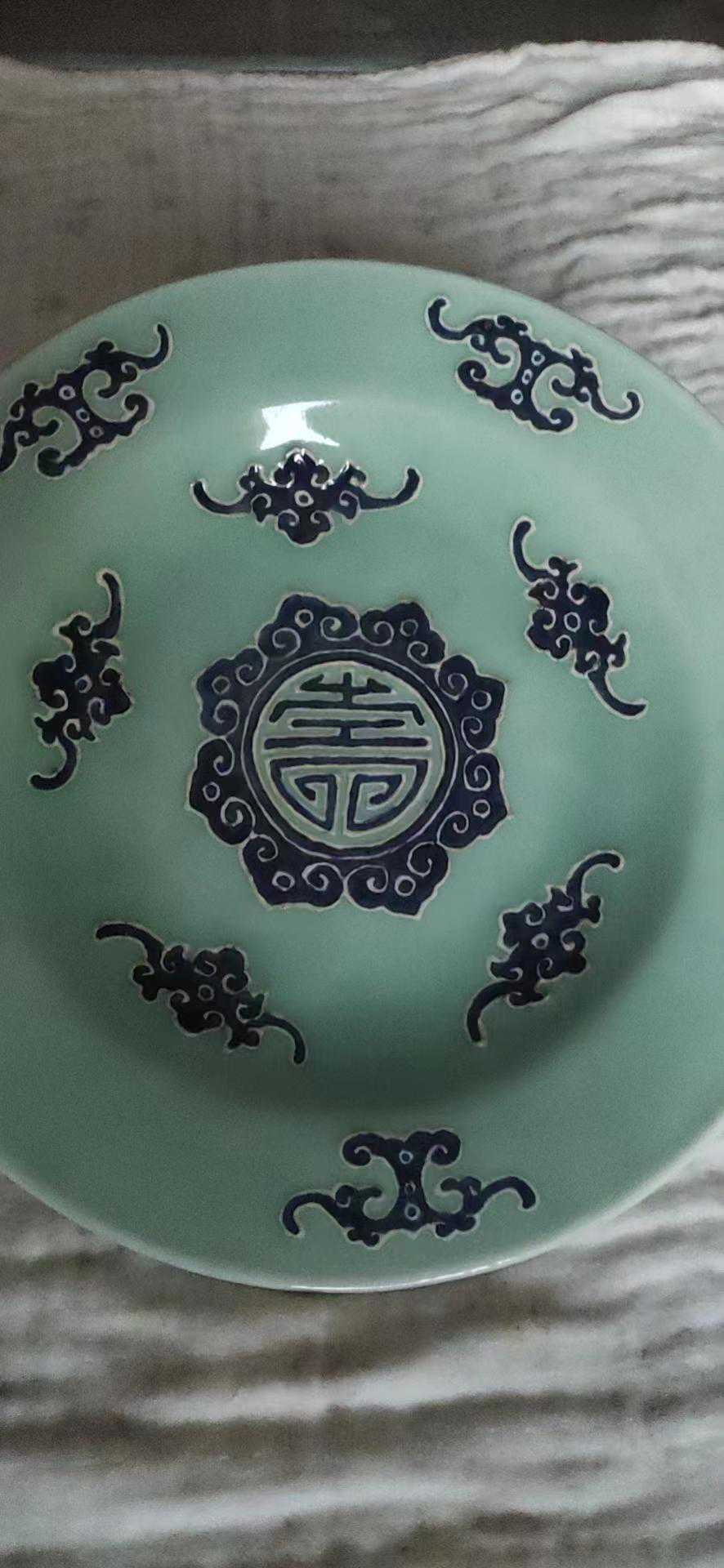 盘内外壁施豆青釉,圆盘中心主题纹饰是青料篆书团寿纹,寿字外缘青料绘如意云头纹,盘中主题纹饰等距离一周,用青料绘五只变形蝙蝠,近口沿处青料绘五只变形蝙蝠纹。底部圈露胎线是内外斜削一刀,呈刀削背,底部中心篆书“大清乾隆年制”。