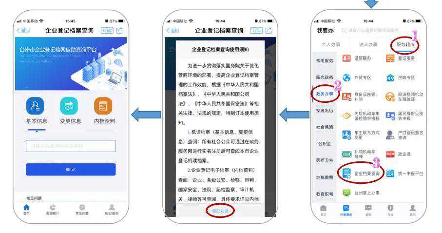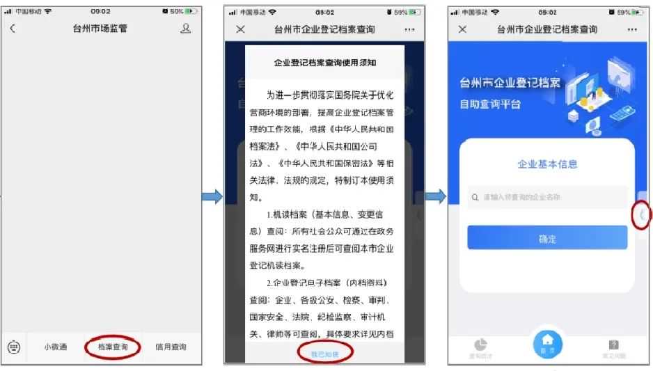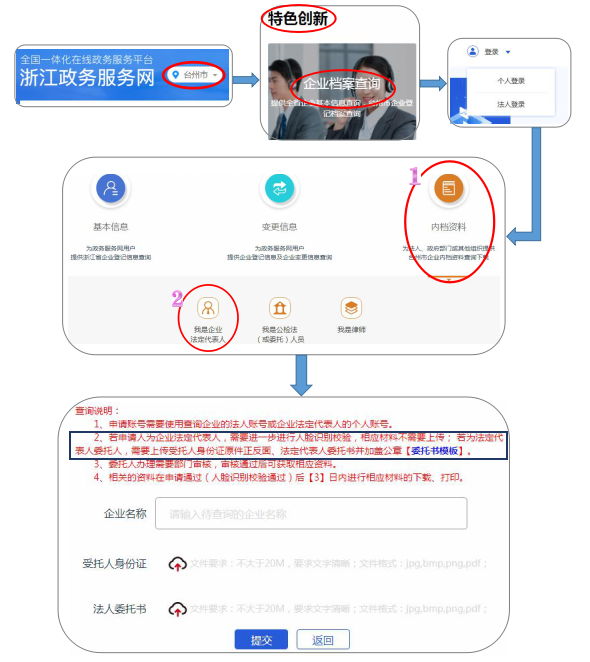 注:进入企业档案查询平台页面之后操作步骤与浙江政务服务网档案查询步骤相同。