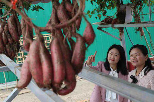 “空中结薯”是应用领先的红薯根系功能分离与连续结薯技术,由传统的土壤栽培转变成营养液栽培,水生根系为植株提供充足的水肥,压蔓产生的不定根成为储藏根,将根系吸收养分和储积养分的两大功能分开,将从前的挖红薯变成了现在的摘红薯,减轻了劳动强度。(蔡长伟张鸿雨)