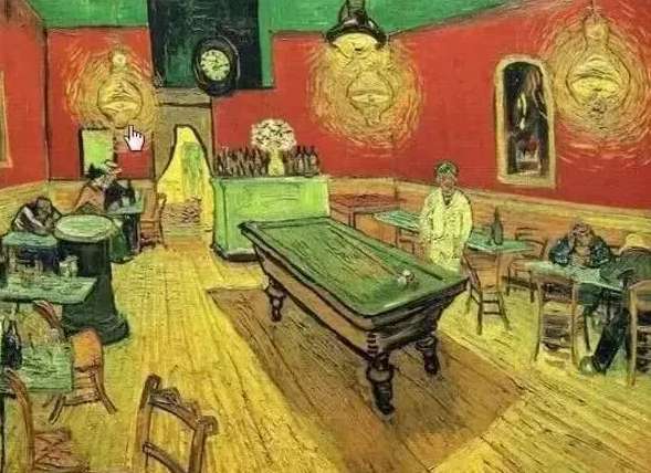 拿破仑去世后30年,梵高出生了。下图是他的名作《夜间咖啡馆》,绿与红的基调似乎充满着不安。梵高说,画中大面积的绿色渲染,就是想表现人类的可怕。