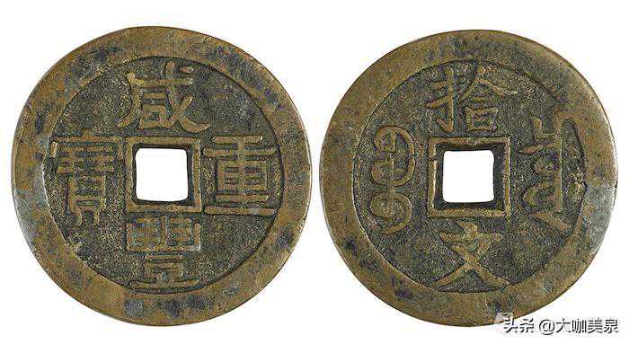 咸丰重宝宝泉拾文试样【直径:38mm】咸丰大钱多为楷书钱文,而此品为隶书书写,背文亦为大写拾文标注币值。该样式未被获准批量铸造,存世稀少。