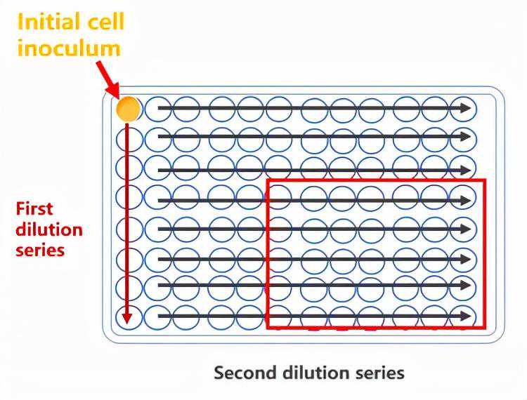 细胞计数设定首排的浓度,例如首孔设置10*cells/孔,每孔50*μl(细胞浓度:100*cells/ml),96孔板补足最终培养体积100ul。