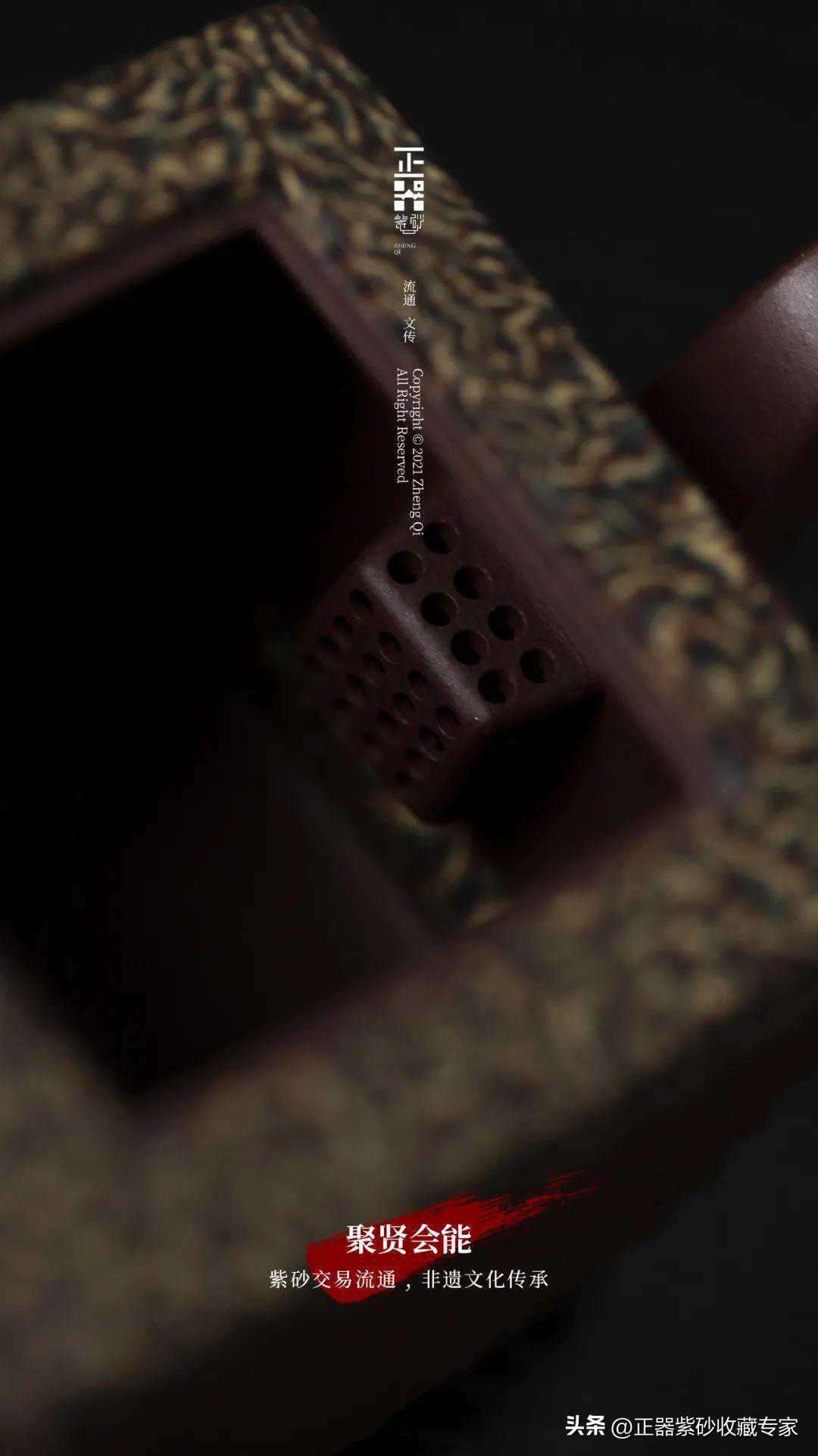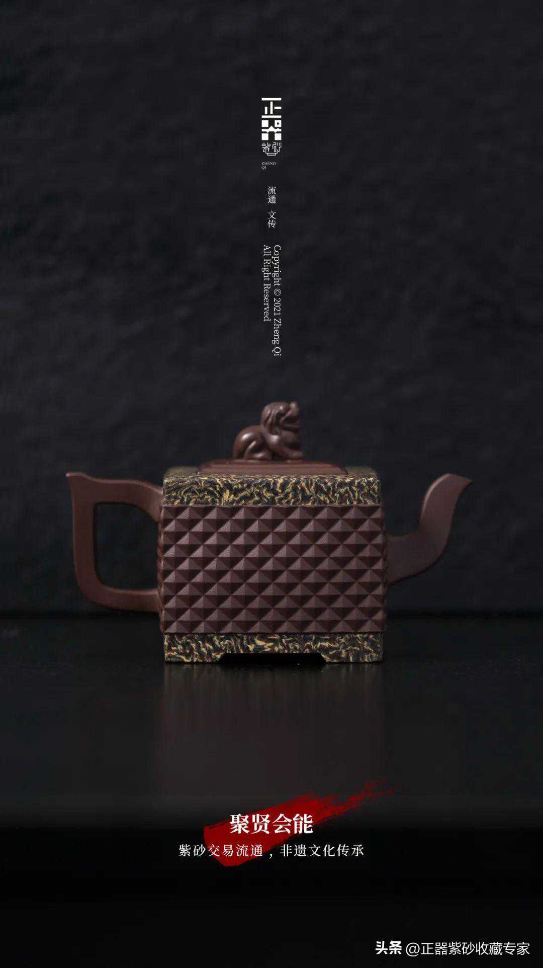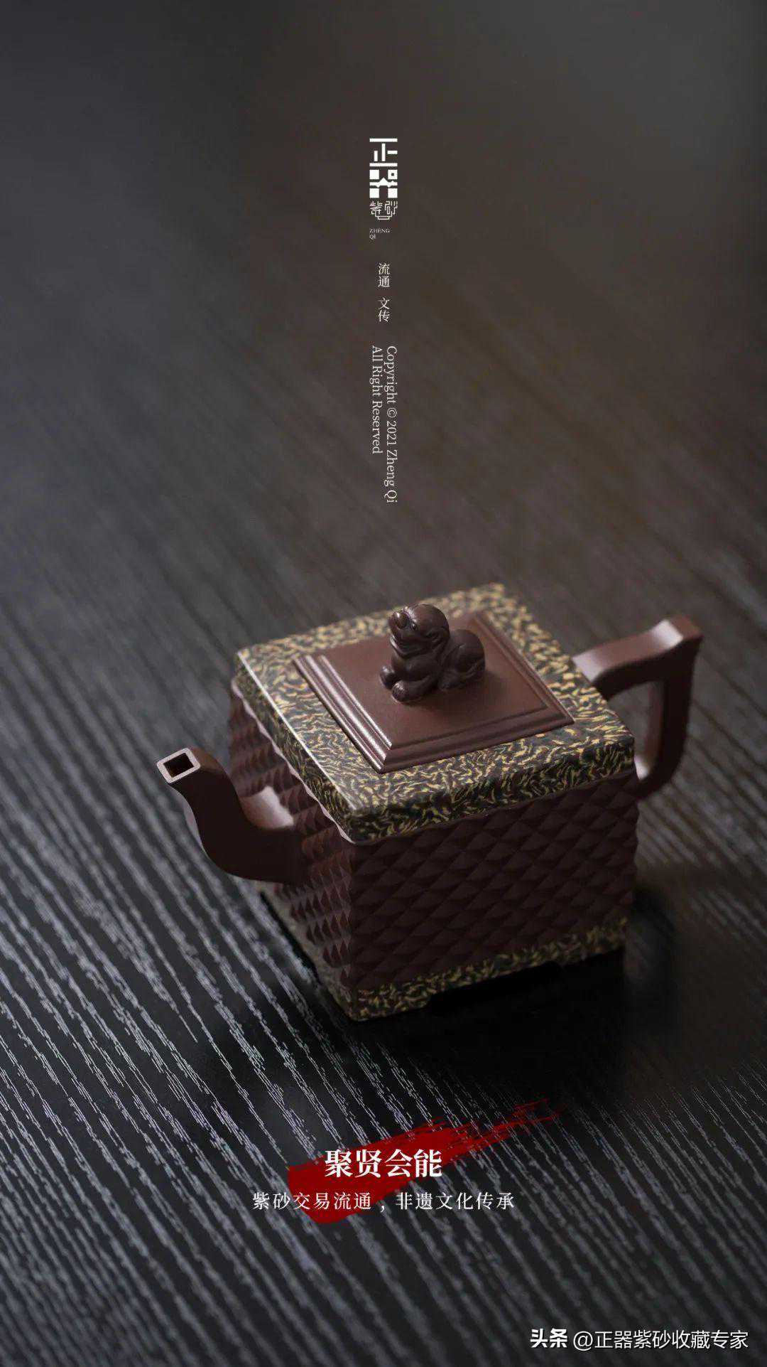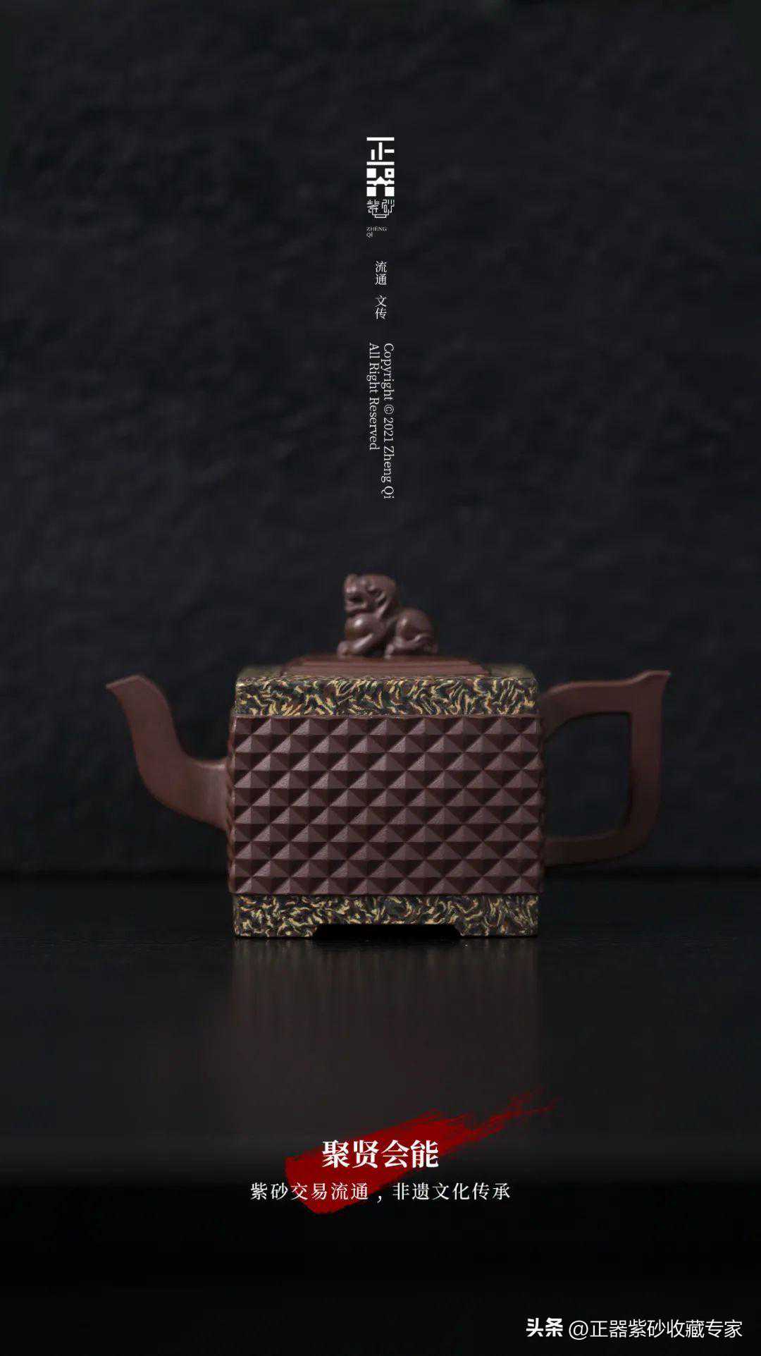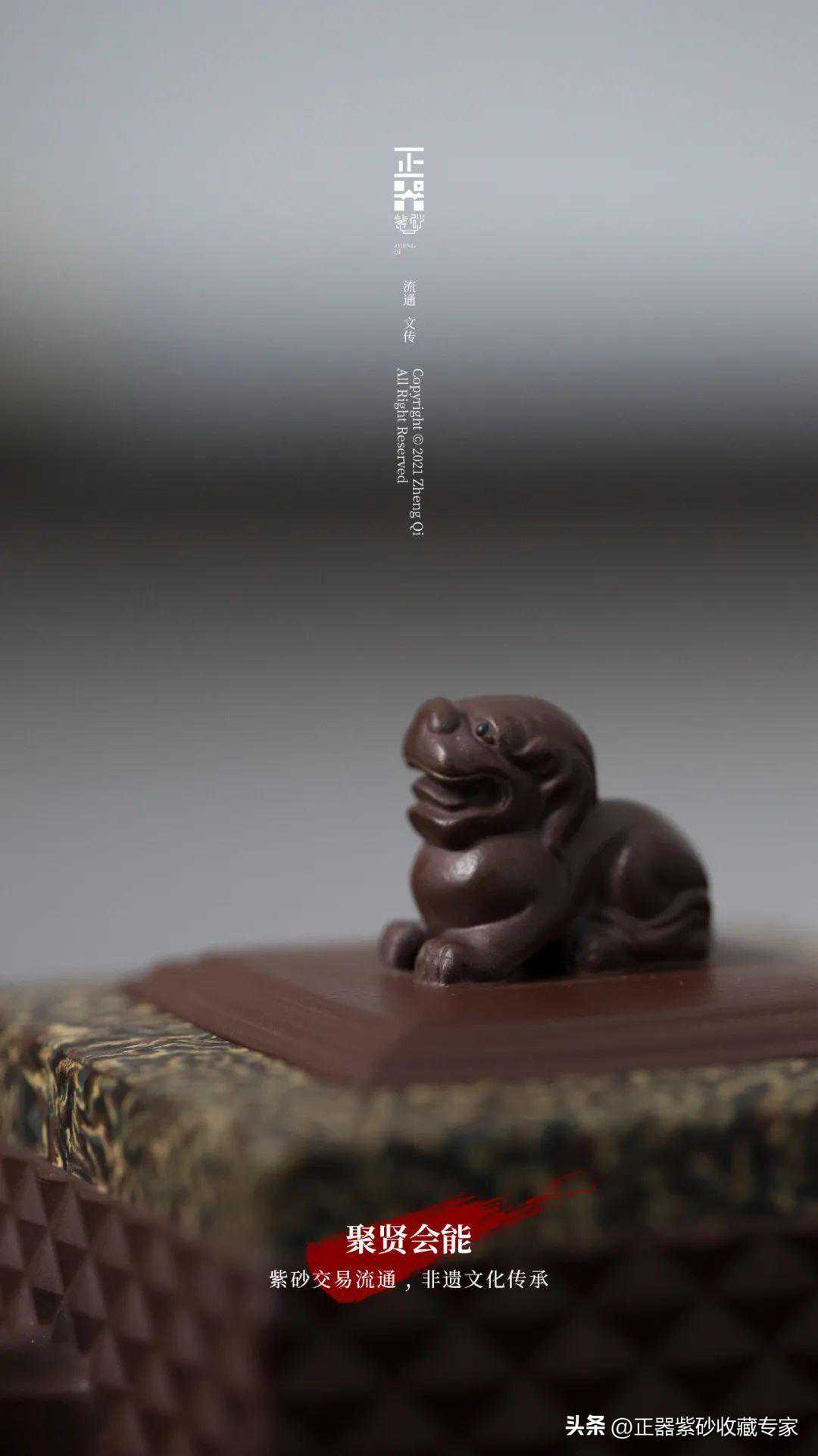 此《钻狮壶》秉承了孔小明老师一贯的大气风格,以我国古代的镇宅瑞兽作为创作主题。整壶以四方定型,线条刚正硬朗,壶把与壶嘴照应壶身,做成方形,一扫阴靡纤弱之风。
