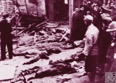 1939年“五三”“五四”大轰炸后,防护团员从废墟中清理出来的被炸市民的尸体情景一。