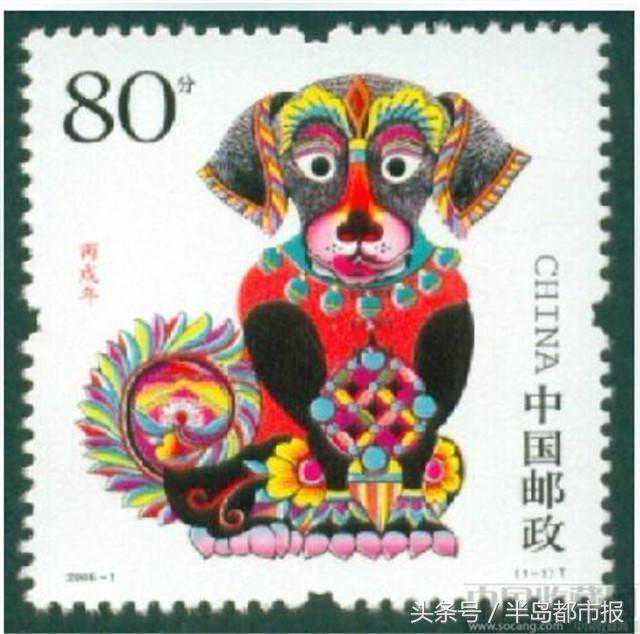 国家邮政总局自1980年发行第一轮生肖邮票,2004年已进入第三轮。2006《丙戌年》为第三轮的第三套生肖邮票,一套一枚,面值80分。邮票图案为剪纸艺术,展现出一只色彩缤纷、神气活现的灵犬形态。(半岛全媒体记者)
