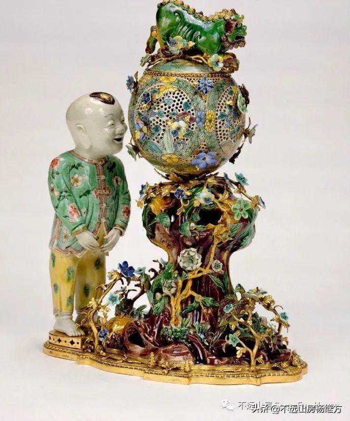 康熙年间外销五彩人物瓷塑,乾隆早期球形五彩香薰,香薰底座,包括花卉都是法国约1740年左右的陶塑,金属件十八世纪法国制作的。盖蒂博物馆藏