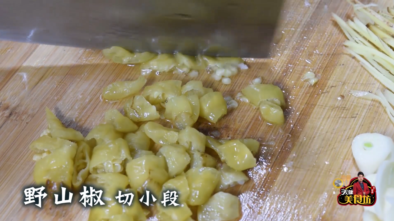 接着,先把生姜切成姜丝放着备用,再把大蒜切成片,野山椒切成小段,小米椒切小段放一起备用!把青椒切成小圈放着备用!