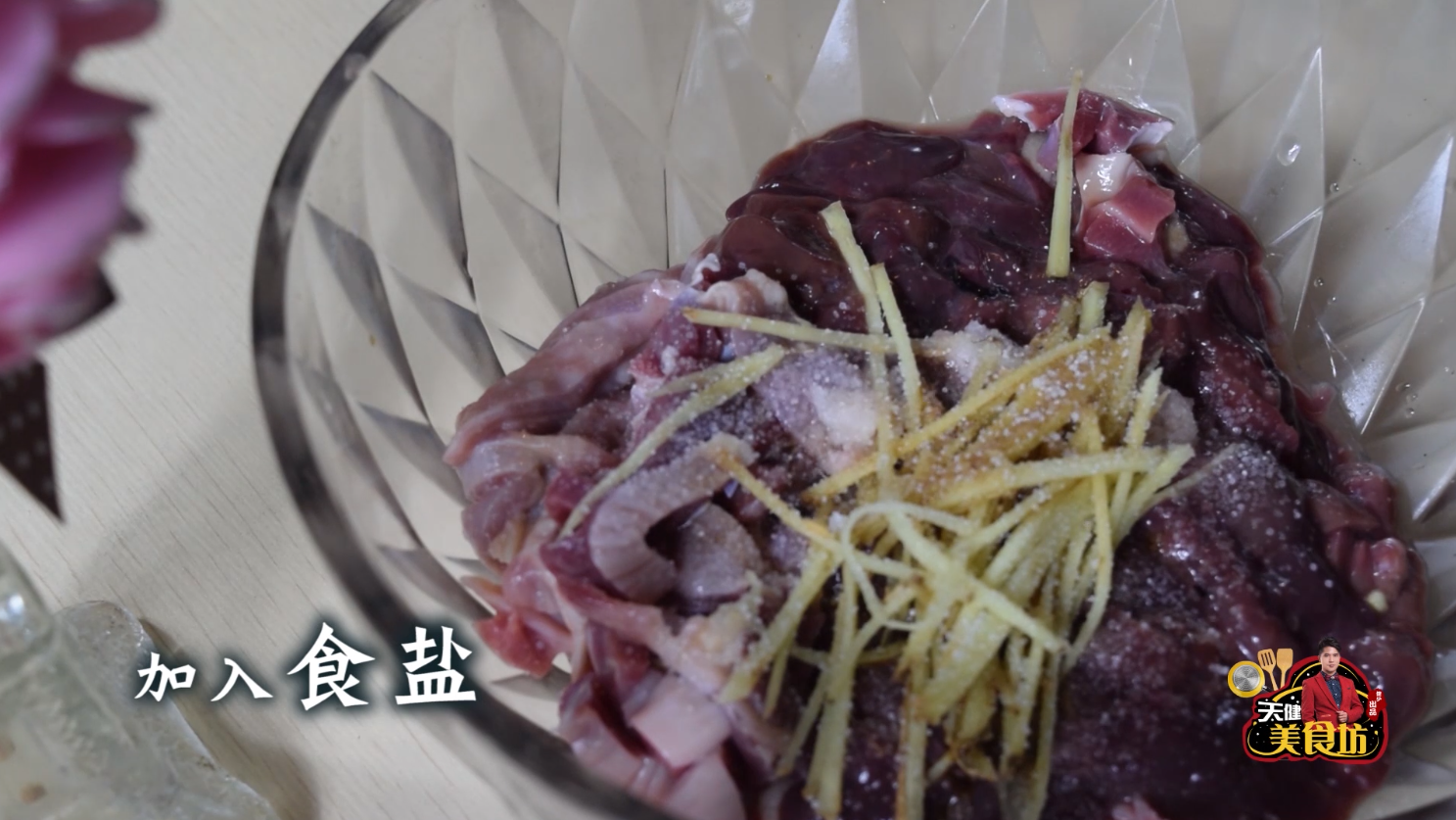 接下来,我们先把鸡胗和鸡肝转移到一个较大的汤盆里面,然后加入姜丝,加入1茶匙的食盐,加入1汤匙的生抽,加入1汤匙的耗油,加入2汤匙的料酒,加入1汤匙的淀粉,然后用手抓匀,腌制一会备用!