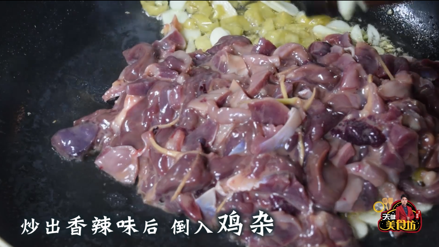 接下来我们开始正式烹饪,起锅加油烧热,油温烧至5成热时,放入野山椒和蒜片,小火炒香,炒香之后,倒入腌制好的鸡胗和鸡肝,大火翻炒至断生,然后倒入鸡肠,翻炒均匀,再淋入少许料酒,翻炒入味去腥!