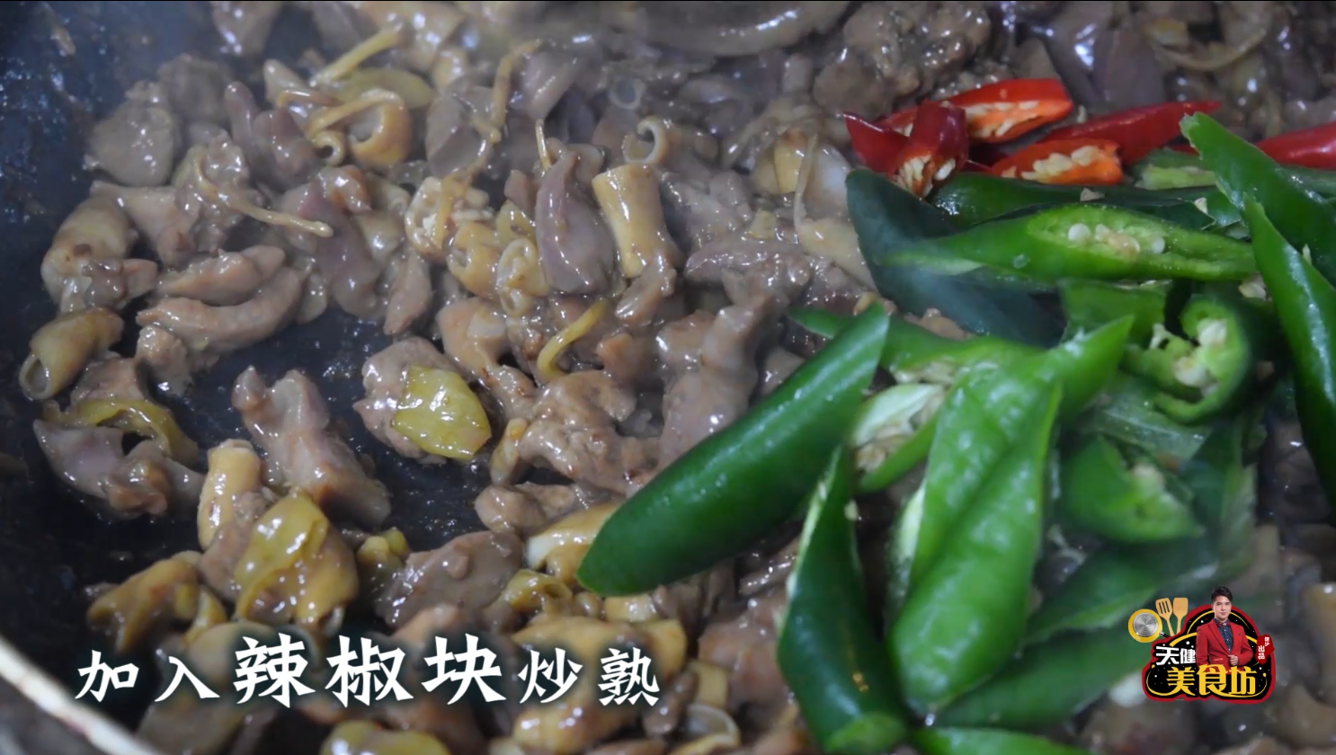 等鸡杂炒至断生之后,加入青椒和小米椒块,再大火翻炒,炒至青红椒断生即可,出锅装盘!