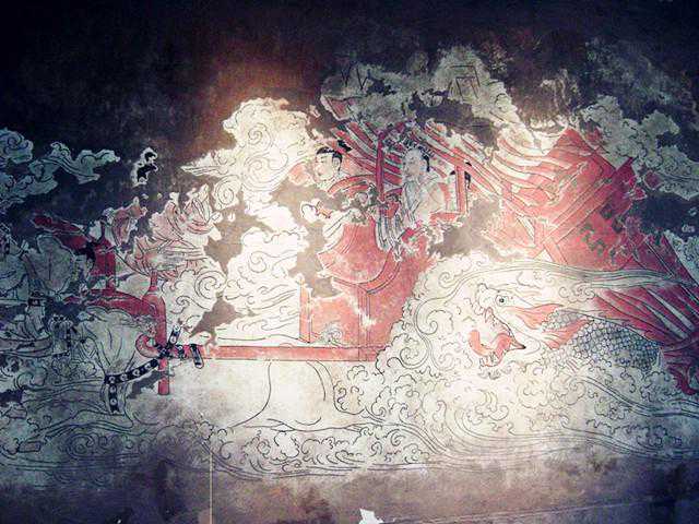 首先,便是位于墓道处左右两旁的壁画,其不仅在画风上极为细致考究、色彩艳丽、活灵活现,且墓道旁2侧的壁画几乎可以达到完全的对称,并共有4幅,即《云中车马图》、《仪卫图》、《青龙图》、《白虎图》。