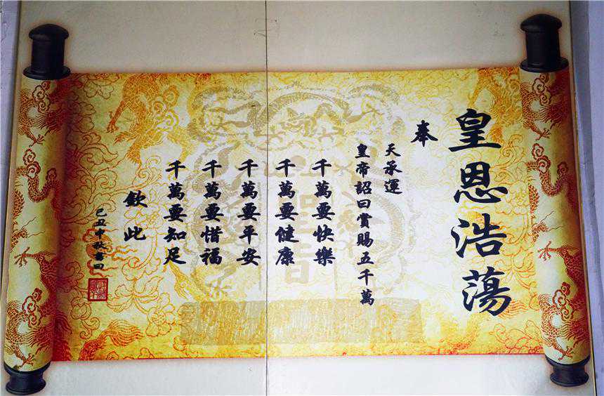 马家大院一共保存了上千件文物,里面的有一个圣旨放在最显著的位置,上书皇恩浩荡四个大字,这里面的故事和慈禧太后有关,当年慈禧太后带着光绪皇帝逃难的时候,经过平遥马家大院的时候,曾经向马中选借了5000万两白银,慈禧太后不想还银子了,所以给了这样一个圣旨,意思是告诉马中选知足,银子就是捐的,也不要想着再来要账了。