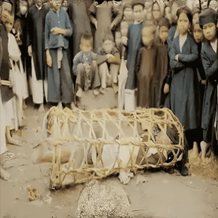 老照片中的女子,正是这一残酷刑罚的受害者。她无助地躺在竹筐中,脸部被布遮盖,无法看到她的表情。
