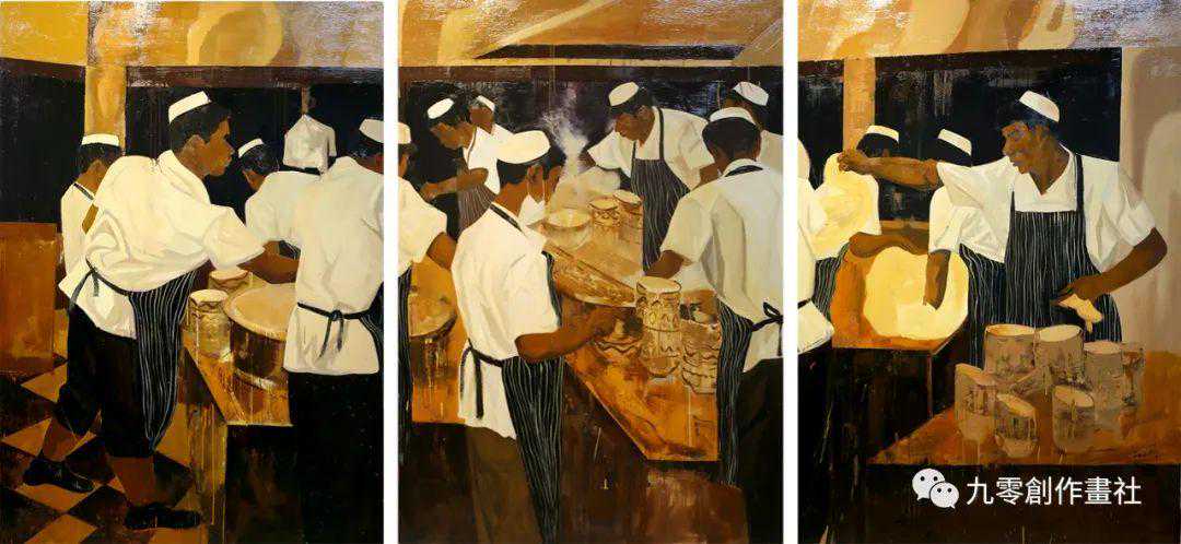 焦全的《五味入河面香起》,描绘了兰州一家面馆的厨房场景。它展示了许多厨师在一起工作,有的在擀面团,有的在疯狂地供应食材。通过消除人的身体细节,这幅画与中国20世纪90年代“新一代艺术家”(新生代)的作品相似。最右边的那个男人把手指指向厨房的中央,像在向他的员工点菜一样,如同20世纪90年代的一些流行艺术图像中的中国士兵。