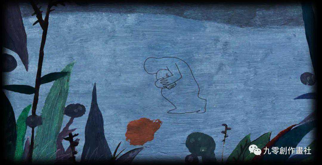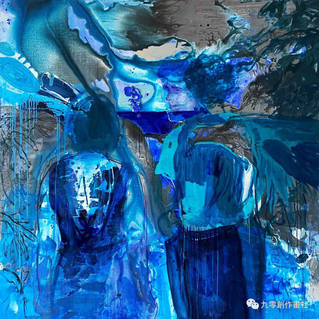 王太斌的《只有在世界的尽头》也是使用了蓝色,但与熊斌的作品非常不同,因为这幅画中的蓝色色调明艳的,而是模糊和褪色的。左边的女人正朝着地平线看,而右边的男人正看着女人的脸。天空中的乌云描绘了一种诡异而混乱的情绪。