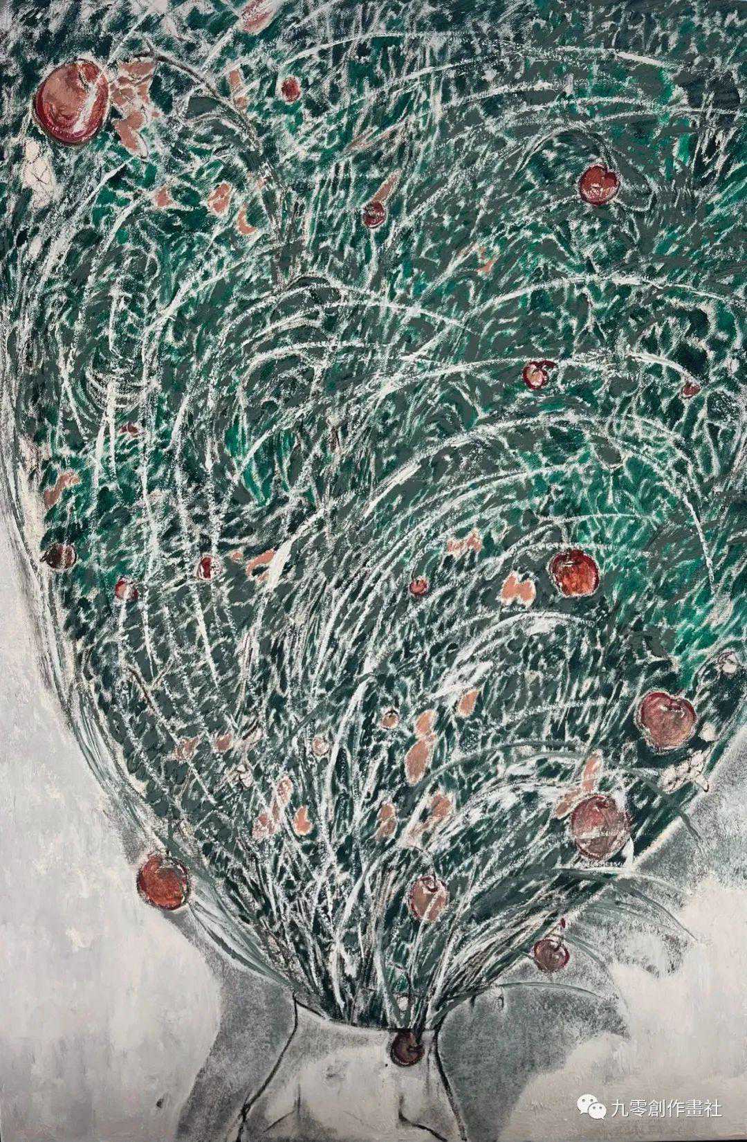 刘俊的《随风意惊澜》是一幅具有强烈印象主义影响的静物画。主要的主题是餐桌中央的一束鲜花。强劲的笔触和干湿交替的手法给作品带来了有趣的律动。