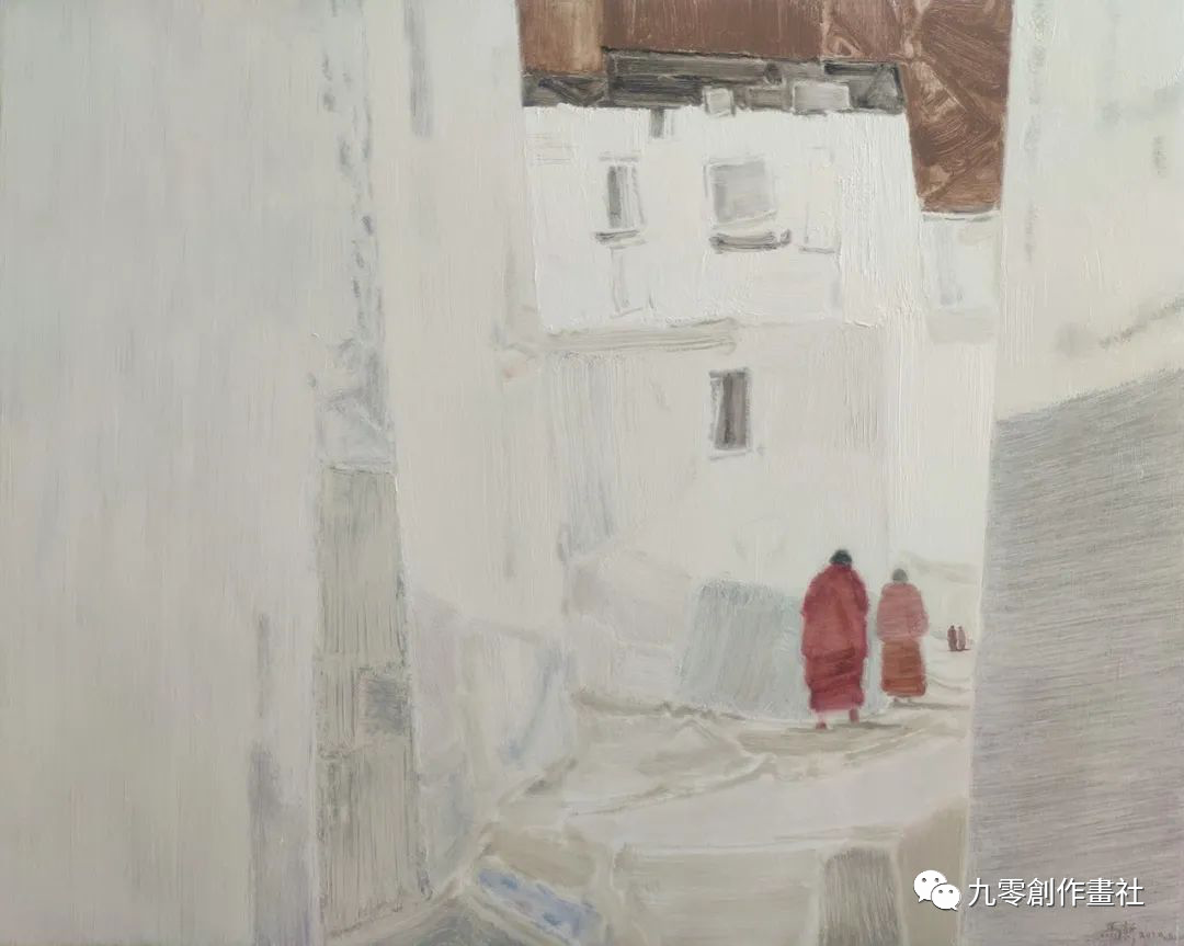 当观众看到马新的作品《圣光晨音》时,如果不是两位僧人在建筑之间行走,他们会认为这幅作品是一幅抽象画。这位艺术家出色地运用了浅灰色和深粉色,在画中形成了如此有趣的对比。