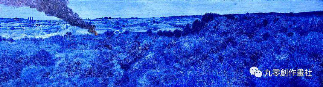 熊斌的《山与平原》展示了一幅用不同深浅的蓝色绘制的风景画。横向的形式和风景画的方式使其具有传统中国画的气质。这位艺术家使用的充满活力的蓝色与伊夫·克莱因的蓝色相似。这一场景是如此强烈和生动,以至于它唤起了世界乌托邦愿景的非物质性和无边界性。