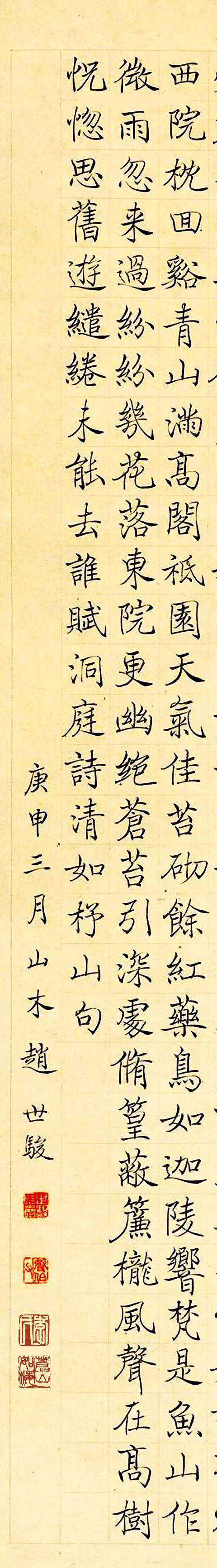 赵世骏,字声伯,号山木,江西南丰人,久居在北京,为陈宝琛弟子,与清书法家鲁琪光齐名。清光绪十一年拔贡,官内阁中书,擅长书法,工寸楷,亦善画花卉,初学钟王,晚学褚遂良,所书几可乱真。
