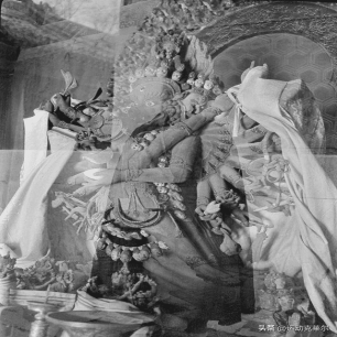 Gamble)拍摄于北京雍和宫,时间在1919年。塑像被装入佛龛中,外面还拦了布,为方便甘博拍摄,帘子布特地掀开。