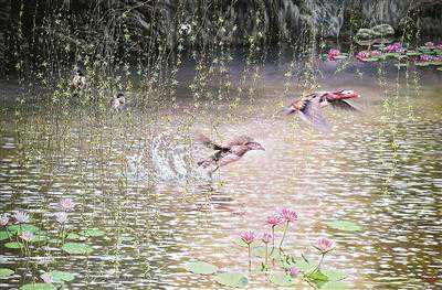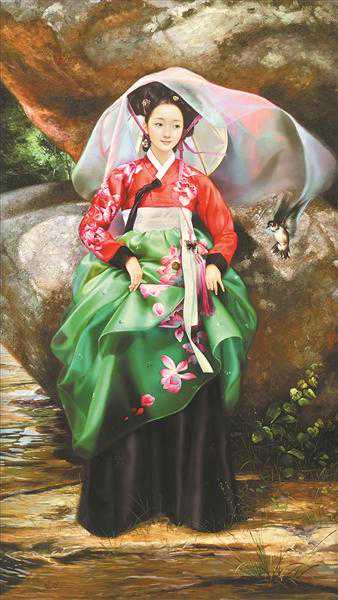 展出的作品中,田园风景方面的作品画面简洁明快,色彩搭配协调,充满了生活气息和浓郁的民族风情,比如,文胜范的作品《比翼双飞》笔触细腻,画面宁静祥和,色调多采用绿色,寓意着对未来生活的希望与向往。在作品《归园田居》中,艺术家金成哲用写实的画风和唯美的画面传递出强烈的美学感受,让人在欣赏画作之时,仿佛置身于静谧和谐的田园之中,体味到那份美感和况味。金贤的作品《金光万缕》则在写实的基础上注重达意,画面空灵剔透,光感十足,阳光照射在树木、石头、水面上又反射回来而出现的迷人光芒,展现了画家对自然的深沉热爱。