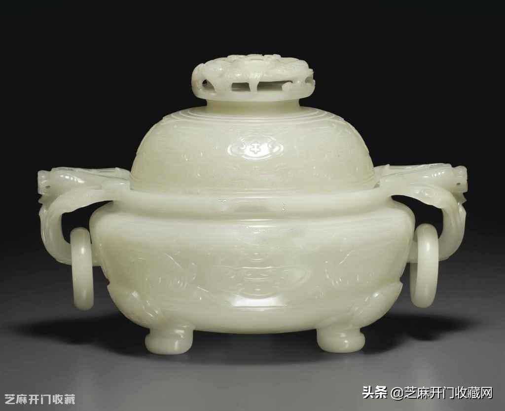 1:清乾隆/嘉庆白玉雕夔凤纹龙衔活环耳三足盖炉,尺寸:宽19.5厘米,成交价:USD527,000