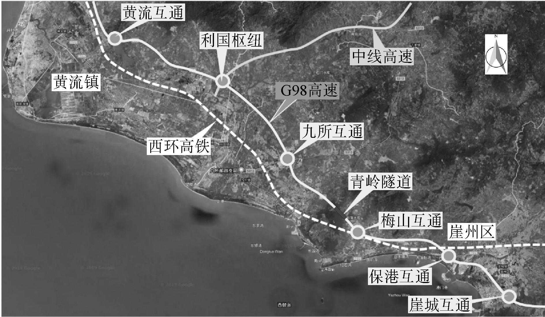 (4)三亚崖州~乐东段。G98高速公路三亚崖州~乐东段(崖城互通~黄流互通)沿海岸布设,伴行西环高铁,穿越九所镇,约53km范围内共设置互通6座,并设青岭隧道1150m/1座,见图5。