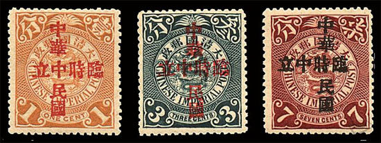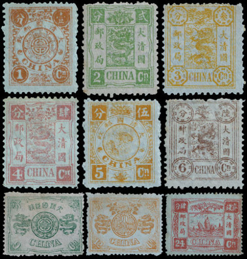 1、1878年开始发行的三期海关大龙票第一期1878始发,共三枚,1分(绿色)、3分(红色)、5分(黄色),半透明薄纸。1882年发二期,面值相同,边较宽。1883年第三期发行,纸厚硬挺。三期均为雕刻版印制而成,图案为舞龙,文字为“大清邮政局”。市面上已经很少出现,仅在几位珍藏爱好者手中,价格无法估量,能够买到的样票在200元左右。