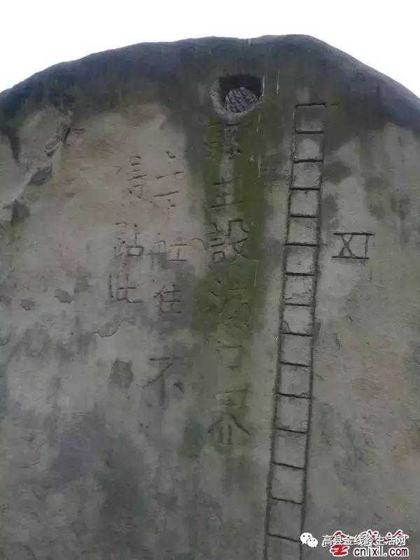 该石前方另有一块小一点的石头上阴刻有“Ⅸ”字样水文标记,多个方形框。与最大巨石相对立10米处有不规则巨石一块,阴刻有“奉口口设立渡口口只不可跕此”,其中“口”为已毁。