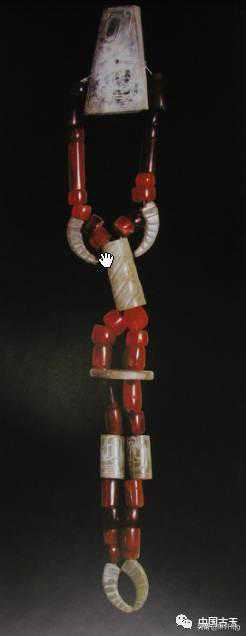 总长68.5厘米。由镂空鸟纹玉牌、玛瑙管、绿松石管、煤精石扁圆珠共计500件组成。玉牌、青玉、梯形、镂空透雕双鸟、鸟尾上翘与华冠相连,身体阴刻线纹。上端有对穿小孔6个,分别维系6串料管,下端有斜穿小孔10个,用以维系下部串饰。
