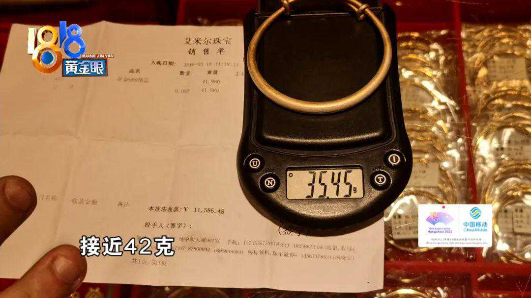 杭州中闽大厦里有家艾米尔珠宝店。张女士说,2016年3月份,在这里买了一只金手镯,花了11500多块钱。她提供的销售单显示,足金999饰品,41.98克。她说当时商家告知足金手镯是实心的,买来后偶尔会戴一下。