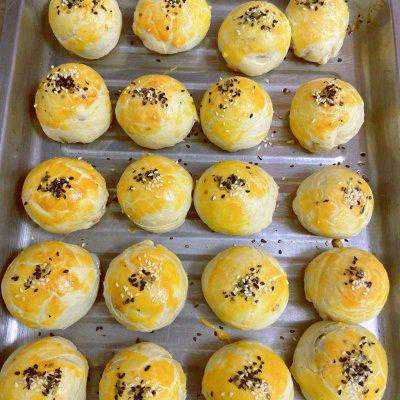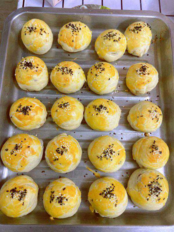 7、做好的蛋黄酥放入预热好的烤箱,先170度烤10分钟,再拿出来刷一层蛋液撒上黑芝麻。再放进去上下火180度烤25分钟