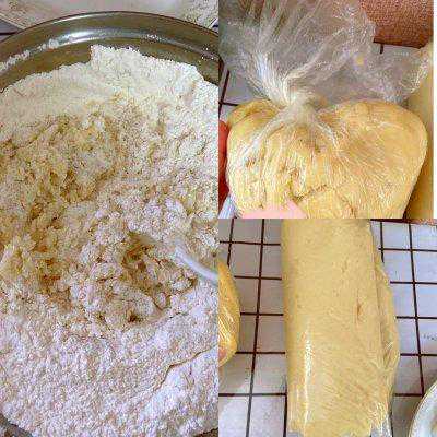 2、油皮部分:全部材料倒入盆里揉成光滑面团,能拉出手膜那种。油酥部分:把面粉和猪油揉成团注意不要揉的太干,油点软点最好!